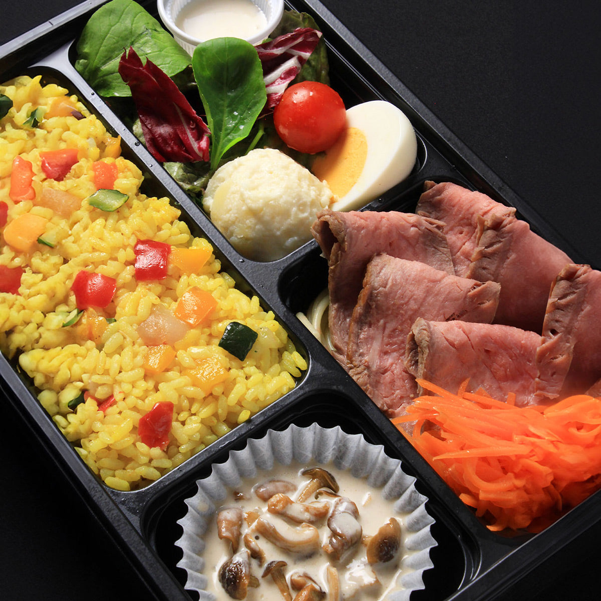 肉のプロ「BUTCHER」監修、10月限定ローストビーフ重。熟成US産ロースを低温調理で香ばしくしっとり仕上げ、ポルチーニソースとバターライスが絶妙に調和する贅沢な一品。