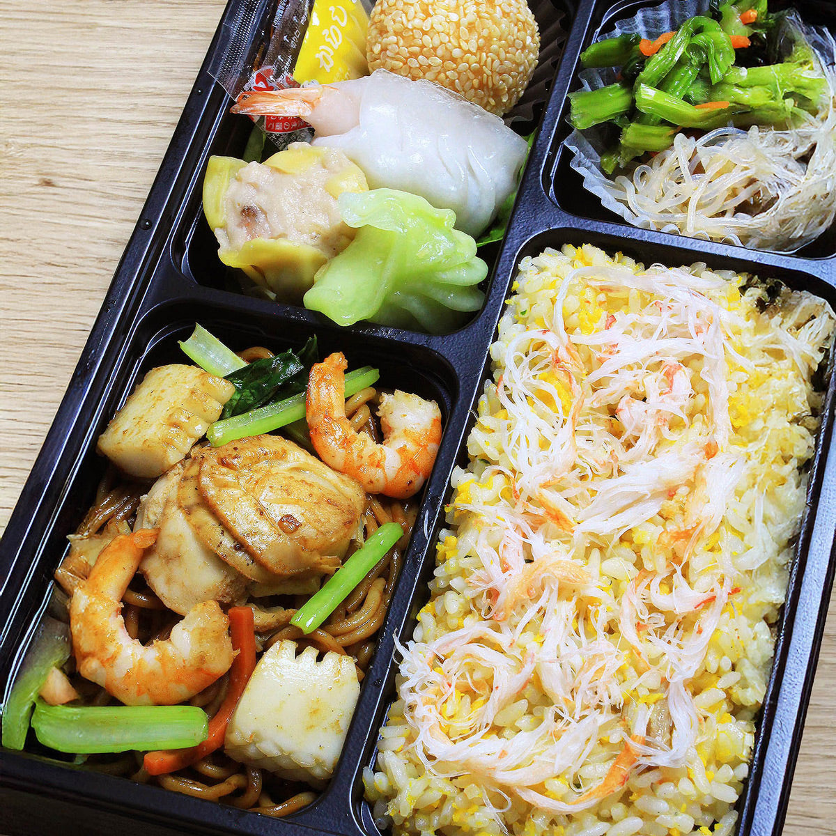 海老・イカ・帆立の旨みが広がる上海焼きそばに、蟹を散らした黄金チャーハン。翡翠餃子や焼売など本格点心も揃った、海の幸を味わう贅沢な中華セットです。